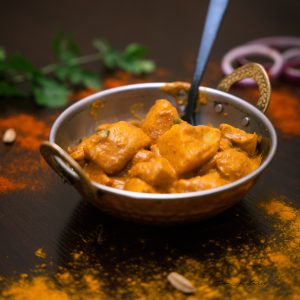 Gigot d’agneau coupé en dés, avec une sauce aux amandes, avec des raisins et noix de cajou.